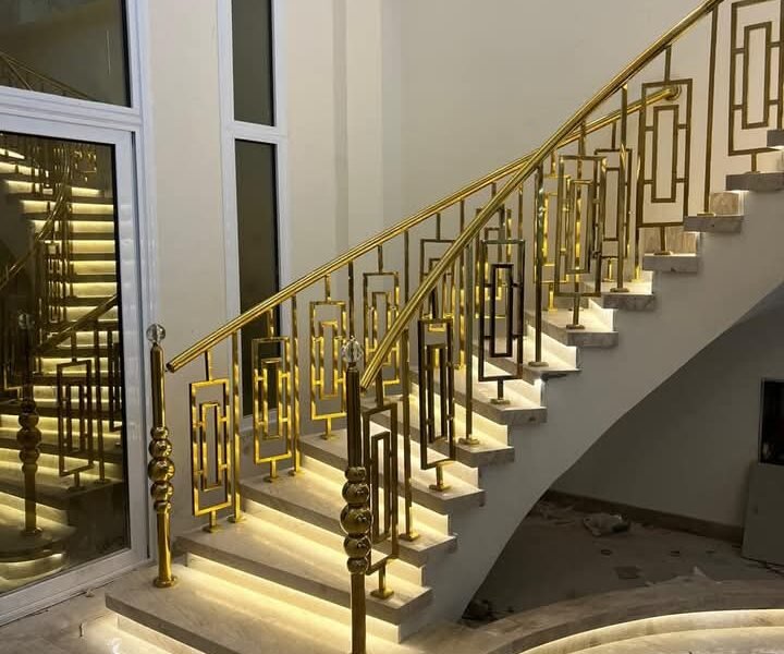درابزين سلالم ذهبي مودرن: تصاميم هندسية فاخرة تليق بالقصور العصرية